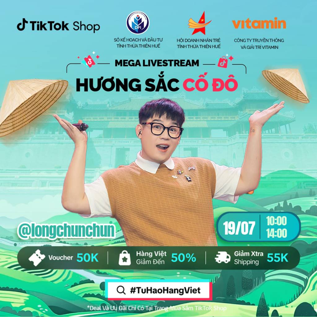 “Hương Sắc Cố Đô” là chủ đề của phiên Megalive đầu tiên được tổ chức tại Thành phố Huế, phiên live diễn ra từ 10h – 14h ngày 19/07 với 10 doanh nghiệp có sản phẩm nghề truyền thống ở Huế. Đồng hành với dự án “Tự hào hàng Việt – Hương sắc Cố Đô” của Sở KH&ĐT tỉnh Thừa Thiên Huế, Hội Doanh nhân trẻ tỉnh Thừa Thiên Huế kết hợp cùng Tiktok Việt Nam và Công ty truyền thông giải trí Vitamin tổ chức phiên Megalive lần này.
